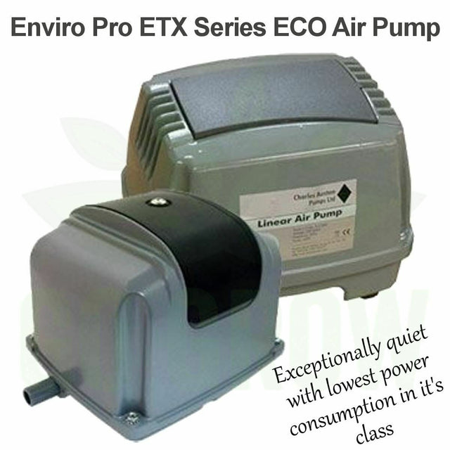 The Charles Austen ETX series range of air pumps ensures that there is plenty of water movement in both aquatic and hydroponic applications; this boosts oxygen levels in the water, circulates nutrients. The Enviro ETX series features energy efficient motors which don't lose performance.