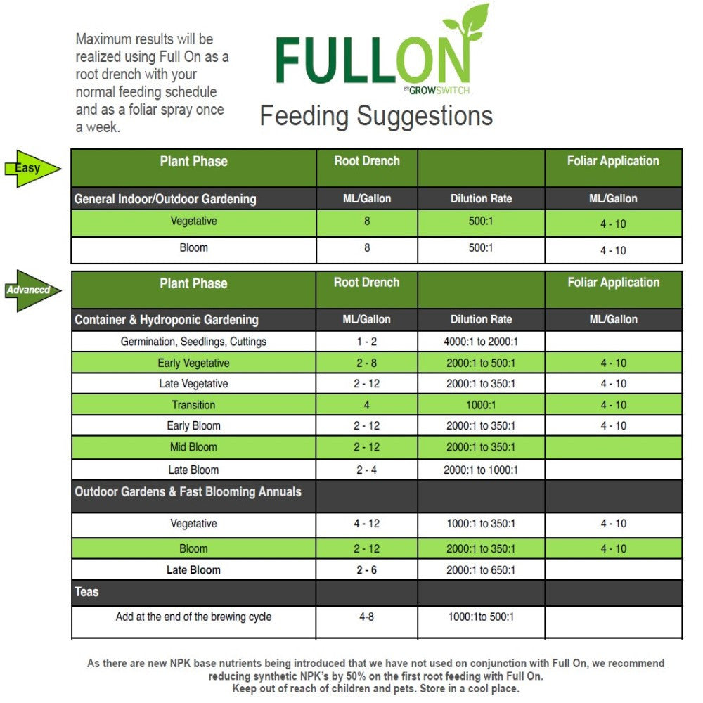 To maximize accelerated growth patterns, root feed Full On at least twice a week along with a weekly foliar spray. Using Full On as both a foliar and root drench creates a synergy in the plant, utilizing Full On’s minerals and nutrients from both the leaves and the roots.