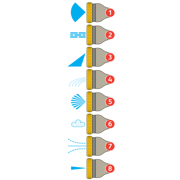 Featuring eight precision-engineered spray patterns, it caters to all gardening and cleaning needs. The cone spray (1) provides gentle watering for delicate plants, while the powerful jet (2) is ideal for tough cleaning tasks. The angled setting (3) produces a flat spray for broad coverage, and the fine rose (4) ensures a soft, even distribution of water. For car care, the flat spray (5) efficiently rinses away soap, while the fine mist (6) is perfect for nurturing seedlings. The shower mode (7) delivers a soft, consistent flow, and the centre spray (8) offers a more focused stream, making it ideal for thorough cleaning applications.