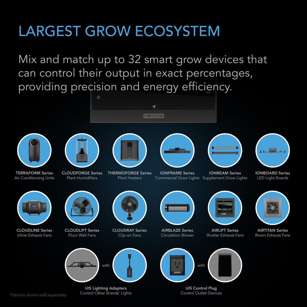 The AC Infinity CONTROLLER AI+ is the first to use artificial intelligence to universally control your devices and oversee your grow. Using AI-derived insight, this self-automating controller can provide unparalleled accuracy and stability while avoiding extreme environmental spikes. Connect to up to 32 UIS™ devices (when using splitter hubs) like fans, grow lights, humidifiers, and heaters to optimize your grow space’s temperature, humidity, and VPD levels. It also features smart outdoor monitoring that tracks the climate both inside and outside your tent for even greater oversight. CONTROLLER AI+ supports upgrades with CO2, H2O, and soil sensors, allowing you to expand sensory capabilities. A reliable ecosystem, this intelligent platform can retain programming even if it's disconnected from Wi-Fi so your grow remains safe and thriving. This product is a part of the UIS™ platform of grow devices and smart controllers, designed to unite with the AC Infinity app over Wi-Fi to achieve your ideal environment.
